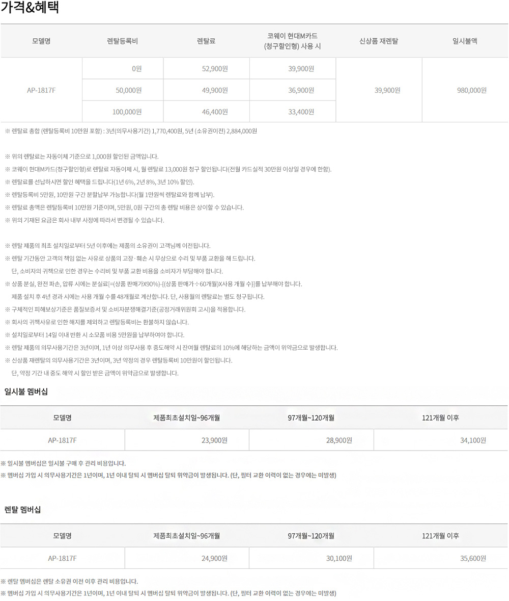 등록설치비면제 / 3년약정 / 5년후소유권이전 / ①극세사망프리필터 ②이중탈취필터(2개월) ③일체형복합필터(12개월)