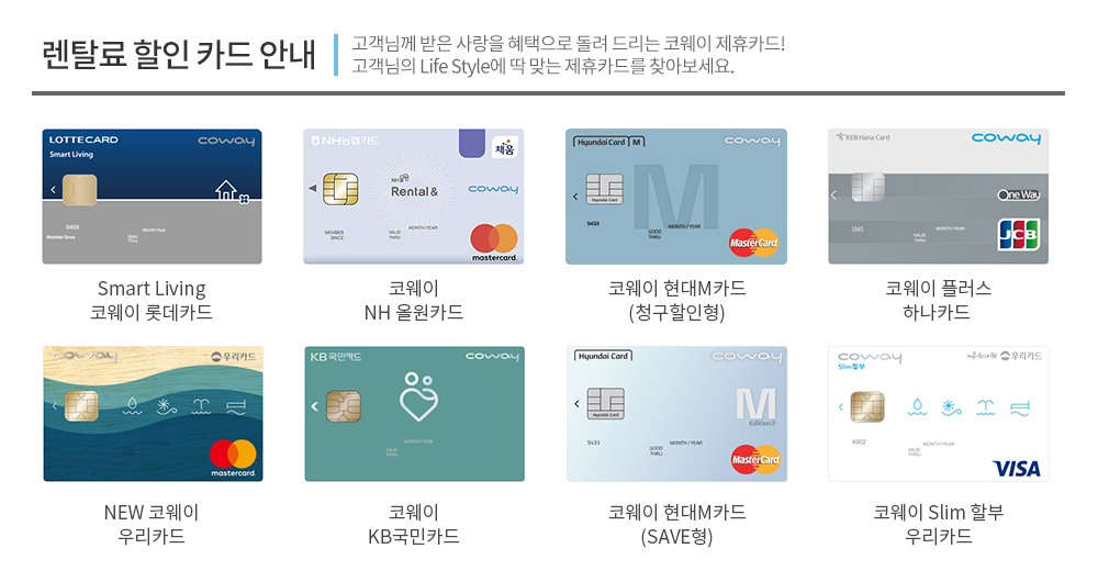 코웨이 KB국민카드 (-20,000원) 코웨이 Slim 할부 우리카드 (-20,000 원) 코웨이 현대M카드(청구할인형) (-17,000 원) 코웨이 플러스 하나카드 (-13,000 원)