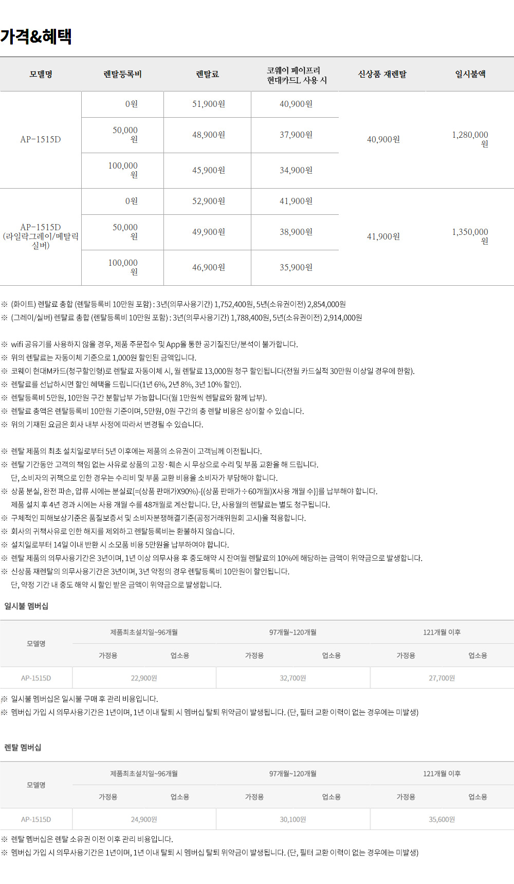 일시불 1,280,000 원 / 렌탈료 총합(렌탈등록비 10만원 포함) - 3년(의무사용기간) 1,752,400 원 - 5년(소유권이전) 2,854,000 원