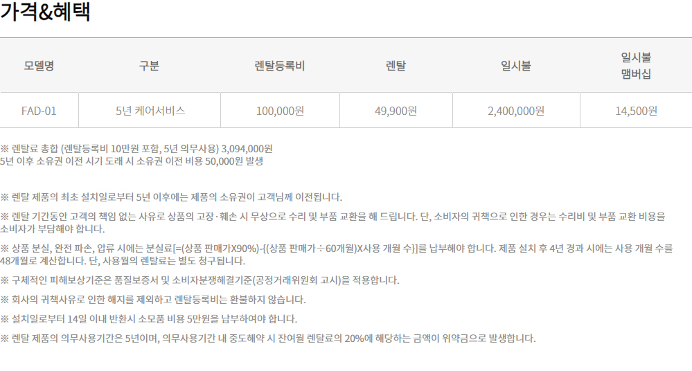 - 일시불 2,400,000 원 / 렌탈료 총합(렌탈등록비 10만원 포함) - 5년(의무사용기간) 3,094,000 원