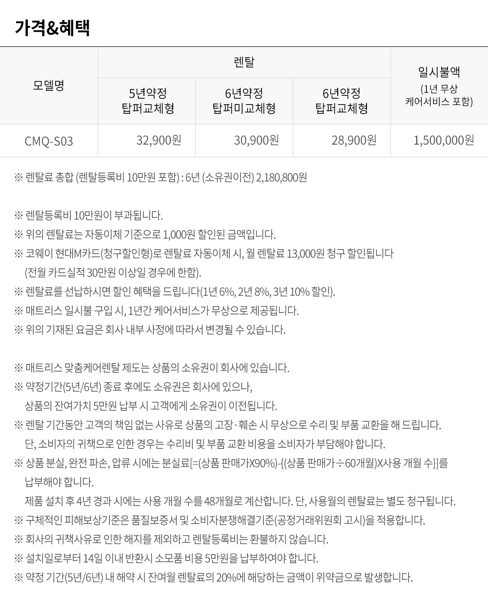 렌탈료 총합 (렌탈등록비 10만원 포함) : 6년 (소유권이전) 2,180,800원