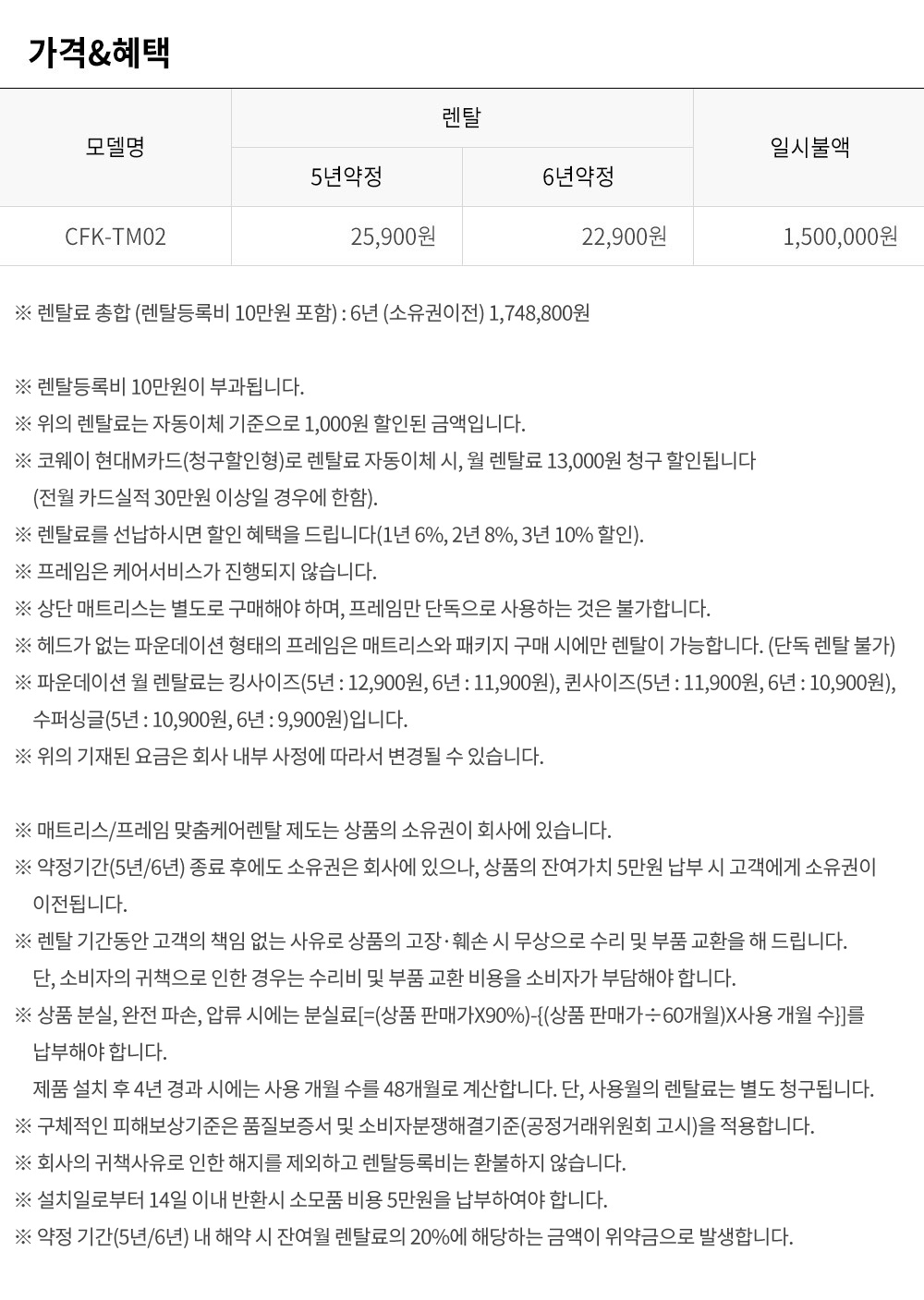 렌탈료 총합 (렌탈등록비 10만원 포함) : 6년 (소유권이전) 1,748,800원