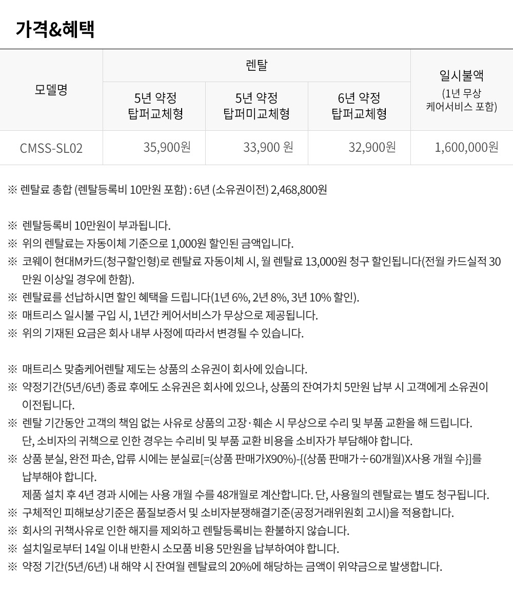 렌탈료 총합 (렌탈등록비 10만원 포함) : 6년 (소유권이전) 2,468,800원