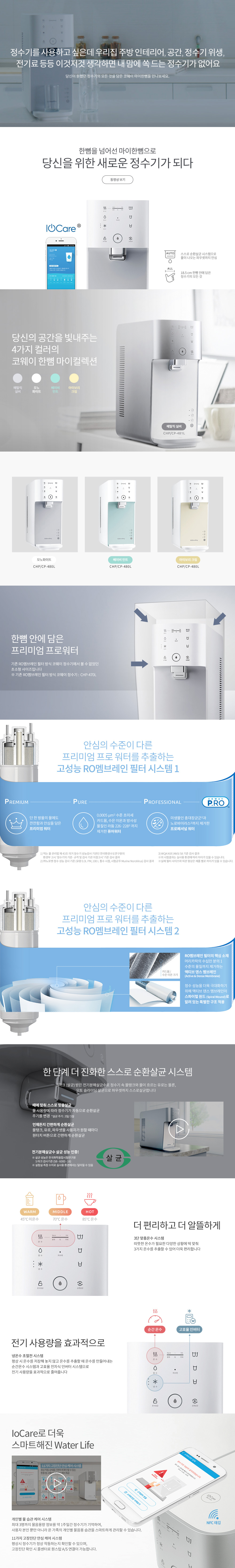 스스로 순환살균, 3단 맞춤온수, 정량 / 연속추출, IoCare / 냉수 1.5 L, 온수(순간 가열), 정수 2.0 L